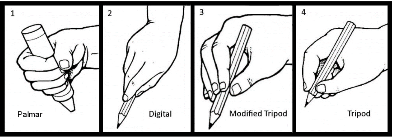 This is the progression of grip development although there are big differences as to what age children acquire the skills. A few children will jump stages while others go through a phase of using a combination of grasps.